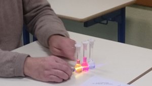 Après la conférence, une séance de "speed meeting" a permis aux élèves de rencontrer les sept chercheurs présents et de leur poser des questions sur leur parcours, leur vie de chercheur, leur sujet d'études tels que la plasticité des cellules, les nanoparticules fluorescentes ou les nouveaux colorants. Ils ont pu observer la fluorescence de nouveaux colorants (voir photo ci-dessous) et examiner des vers C. elegans à la loupe binoculaire.