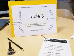 Un speed-meeting a ensuite permis aux lycéens d’échanger directement avec les scientifiques présents, qui sont passés de groupe en groupe à raison de 12 minutes précises par groupe de 4 élèves. La sonnerie de la cloche, sous la houlette de Carine Etaix, indiquait la fin de l'échange, souvent au grand regret des participants.