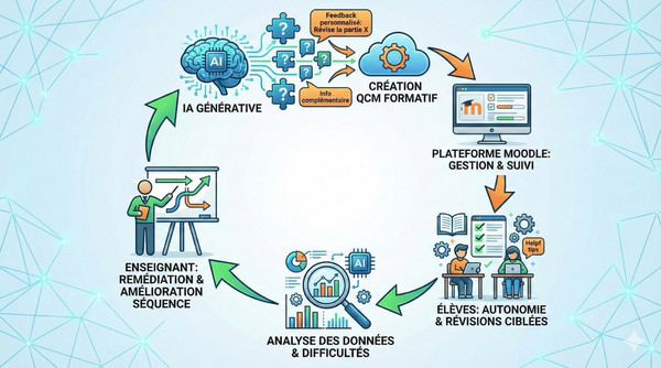 Julien Pargade, professeur d'histoire géographie au collège Victor Schoelcher d'Ensisheim propose une approche qui combine l'IA générative (création rapide de QCM avec feedbacks personnalisés, la plateforme Moodle/Eléa (gestion des tests et suivi des résultats) et l'analyse des données (identification des difficultés collectives). Elle favorise l'autonomie des élèves dans leurs révisions tout en permettant à l'enseignant d'optimiser son temps et d'améliorer sa pratique pédagogique.