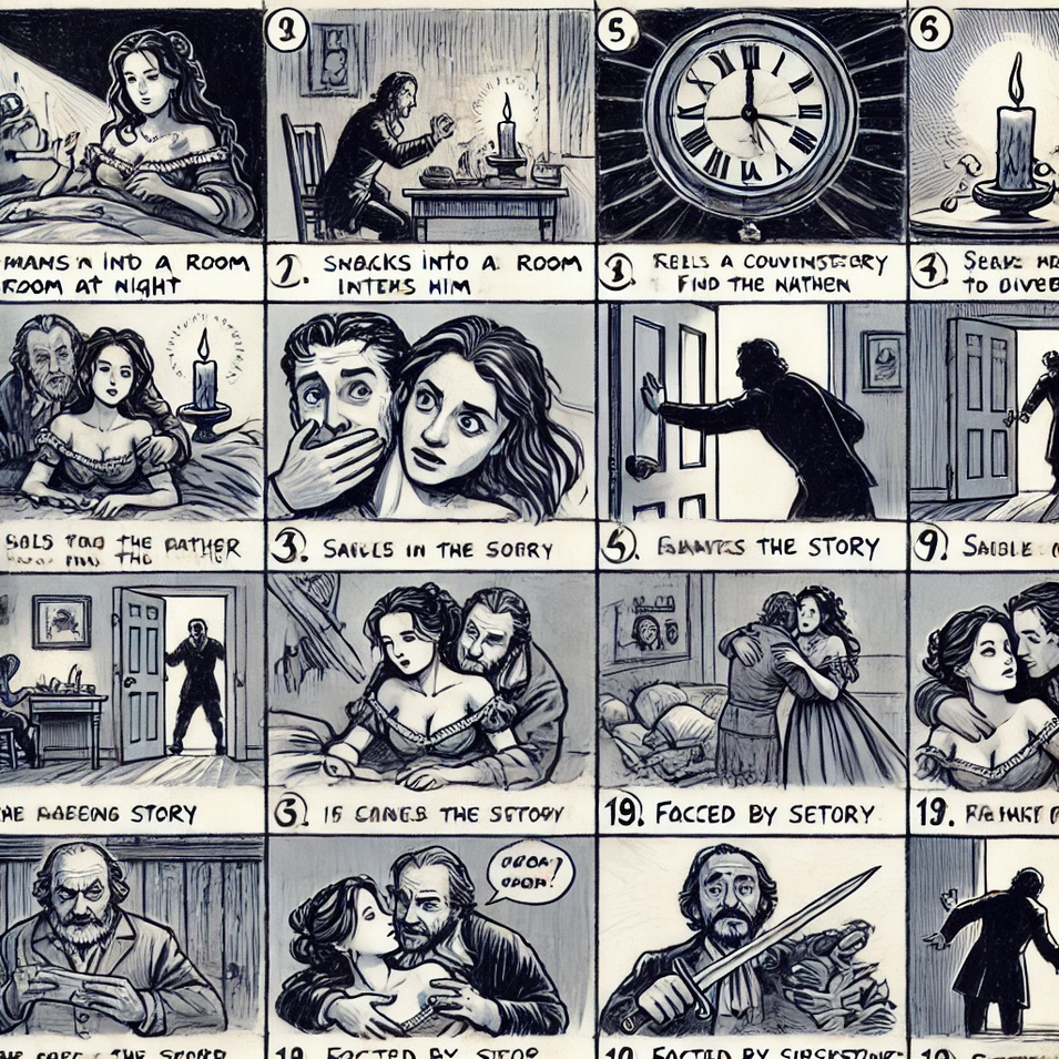 On observe aussi une récurrence du motif de la porte entrouverte, où un personnage est saisi en train d’entrer ou de surprendre une scène. Cette idée, présente dans le storyboard IA sous une forme dramatique (silhouette massive, contre-jour)
