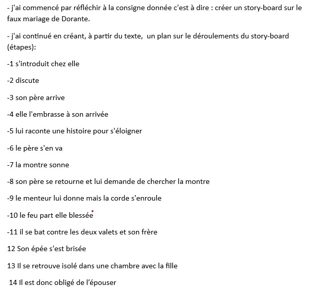 Si quelques élèves parvenaient à le reformuler, beaucoup n’en saisissaient ni la logique, ni l’humour. Pour lever ce blocage, la classe a décidé collectivement de concevoir un storyboard mettant en images le récit de Dorante.