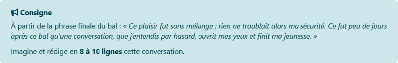 La séance s’ouvre sur un temps d’écriture créative pendant lequel chaque élève imagine et rédige une hypothèse de prolongement du texte de Claire de Duras. La consigne donnée aux élèves est la suivante :