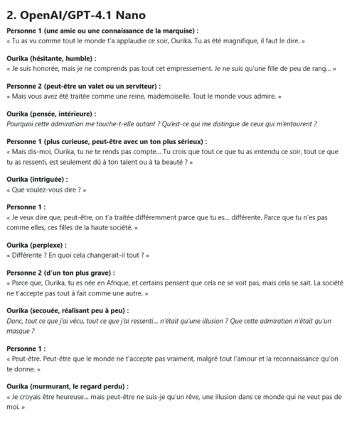 Pour le second texte (OpenAI/GPT-4.1), les remarques des élèves se sont principalement concentrées sur des questions de forme générique : le recours massif au dialogue et aux didascalies a été perçu comme problématique, le texte ressemblant davantage à un texte de théâtre qu'à un récit romanesque. Cette observation, bien que technique, révèle une attention aux codes narratifs et aux conventions de genre – compétence essentielle dans la construction d'un « regard d'auteur ».
