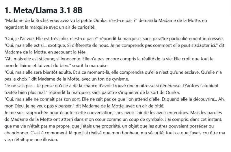 « Je trouve que l’IA a créé une bonne ambiance : “Dans le salon lumineux de la marquise, les rires et les murmures des invités se mêlaient à la musique douce d’un couturier.” […] Mais je trouve que Claire de Duras a plus décrits de sentiments que l’IA. »