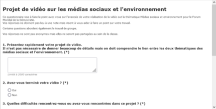 Par la suite, je leur ai fait parvenir un sondage pour les questionner sur l’avancement de leur projet, sur les difficulté rencontrées dans la réalisation du travail ou dans le travail de groupe. Le but de ce sondage est à la fois d’avoir un état des lieux de leurs travaux mais de les amener à adopter une attitude réflexive sur leur travail.