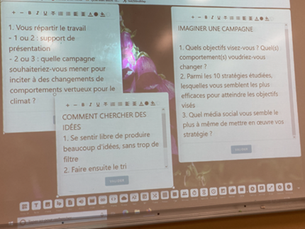 Dans le second temps du cours les groupes ont poursuivi leur travail pour envisager la réalisation concrète de leurs idées (ou en formuler de meilleures) et chaque groupe a pu présenter succinctement son idée de vidéo à la classe.