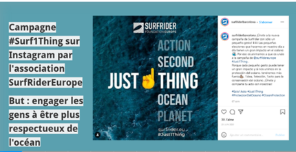 L’essentiel du cours a consisté en une analyse précise de la campagne #just1thing de la Surfrider Foundation Europe sur Instagram (je me suis d’ailleurs créé un compte Instagram pour l’occasion), analyse dans laquelle je détaillais l’ensemble des stratégies de communication mises en œuvre par la campagne #Just1Thing.