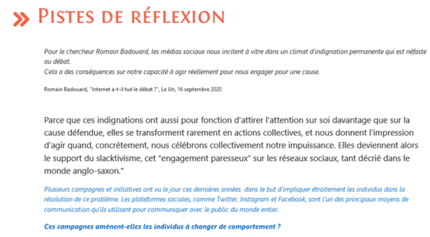 J’ai ouvert cette séance par une citation de Romain Badouard dans un article paru dans Le Un (“Internet a-t-il tué le débat ?”, Le Un, 16 septembre 2020) qui met en avant la question de l’”engagement paresseux” induit par les médias sociaux.