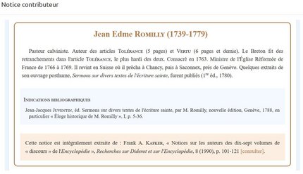 Dans la dernière partie de ce travail, les élèves sont invités à contribuer eux-mêmes à wikipedia. En lisant les biographies des encyclopédistes publiées sur le site ENCCRE, ils cherchent des éléments à ajouter à différentes pages de façon à enrichir l’encyclopédie collaborative. L’exemple à partir de la biographie de Romilly permet de guider les élèves dans cette démarche grâce à laquelle ils se font eux-mêmes encyclopédistes. Ainsi lit-on sur ENCCRE que Romilly a exercé la fonction depasteur à Saconnex près de Genève.