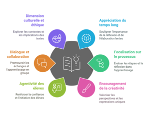 Cette pédagogie favorise les échanges entre pairs : discussions sur la pertinence d’une analyse, comparaisons de lectures différentes d’un même texte, élaboration collective de grilles d’évaluation qualitative. Sans focaliser sur l’IA, l’enseignant crée des situations qui incitent les élèves à confronter leurs idées, à co-construire des critères d’exigence, à négocier la signification d’un passage. Ainsi, la classe devient un espace de circulation des savoirs où la dimension sociale de l’apprentissage littéraire est renforcée. - Revaloriser la dimension culturelle et éthique de l’étude des textes