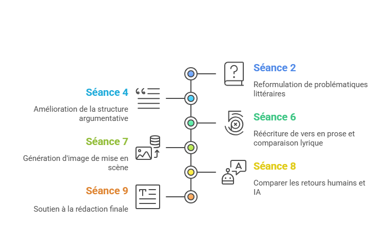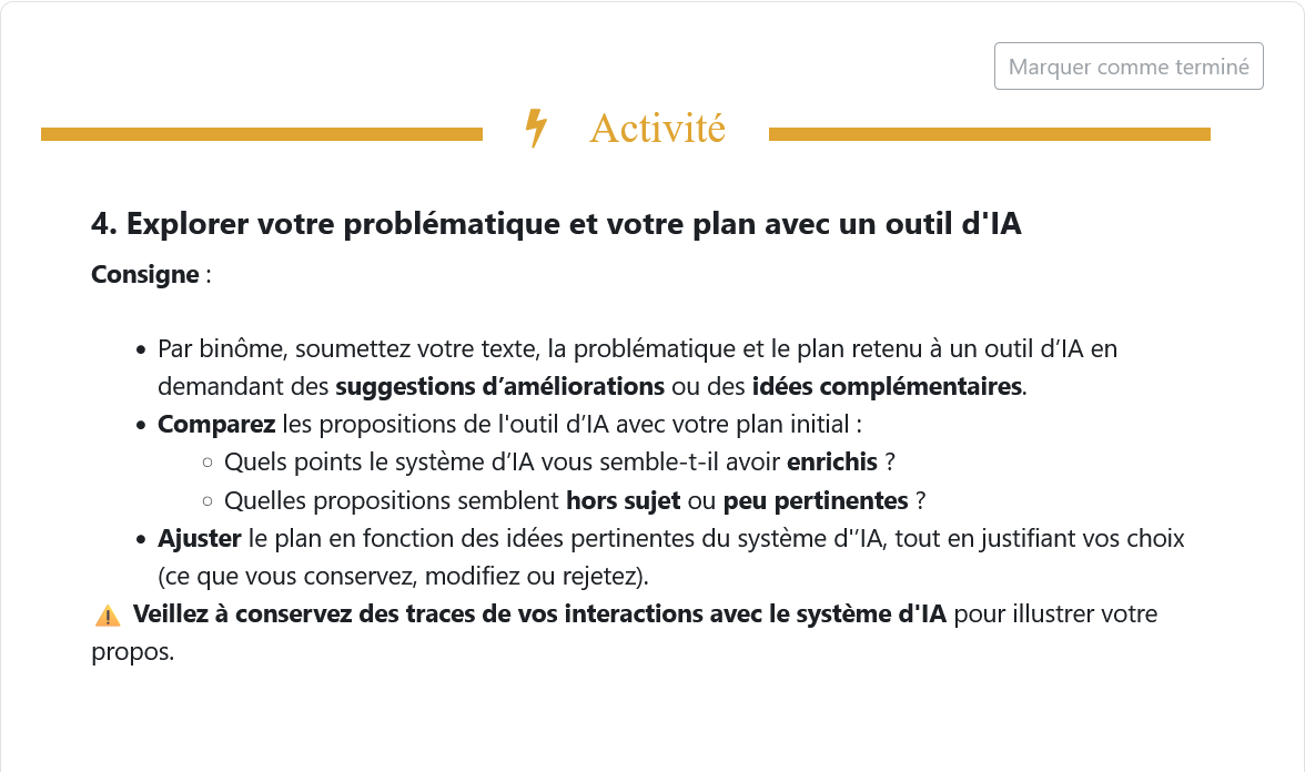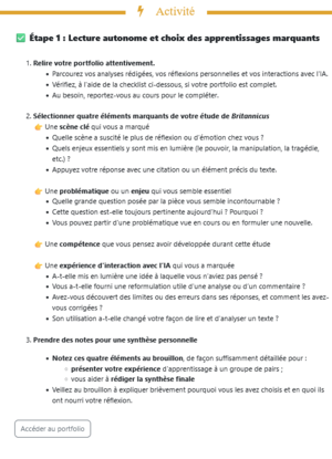 | Séance 4 | Collaborative, métacognitive | Rédaction de problématique + plan + feedback IA + révision (Portfolio 5-6) | Structurer une analyse argumentée, comparer interprétations (pairs/IA) |