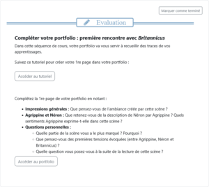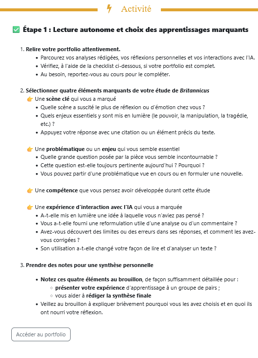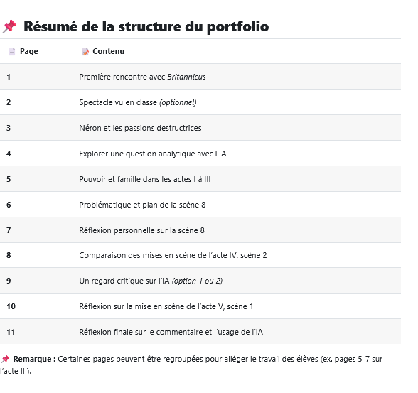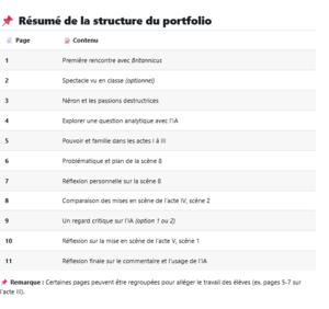 Ce travail constitue un temps de retour sur soi et sur le parcours accompli. Il permet de consolider les apprentissages, de prendre conscience des compétences acquises, et d’adopter une posture réflexive vis-à-vis des outils mobilisés, notamment le portfolio et l’IA. C’est également une manière de donner du sens à l’ensemble de la séquence, en inscrivant l’étude de Britannicus dans une logique d’appropriation active et critique.