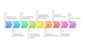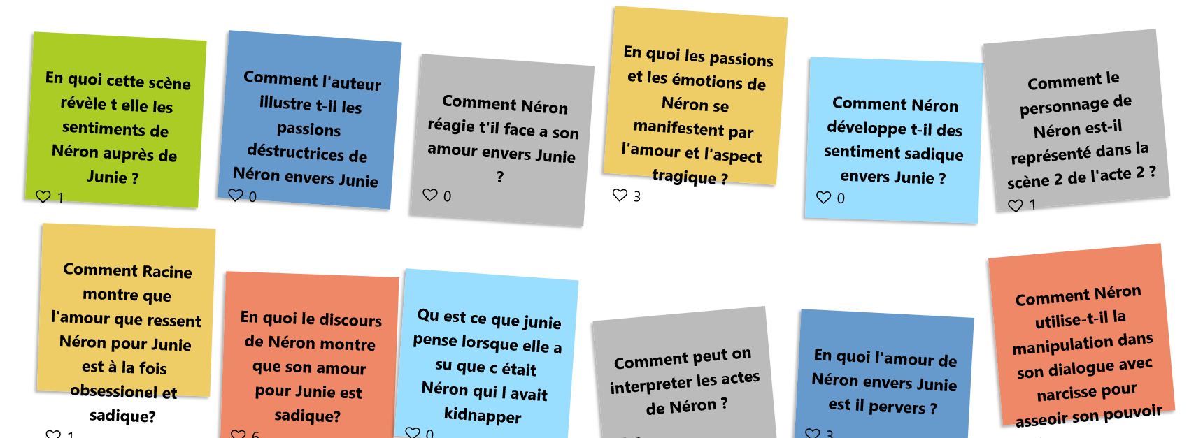La scène 2 de l’acte II, où Néron exprime sa passion tourmentée pour Junie, inaugure un travail articulant lecture de la pièce et apprentissage méthodologique. Après une lecture collective approfondie et une identification guidée des procédés stylistiques, les élèves sont invités à formuler une problématique personnelle à partir du texte et à la partager sur un mur collaboratif.