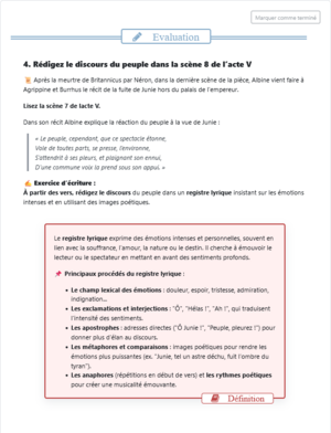Ainsi, un élève partant d’une question formulée de façon pertinente – « Comment Racine montre-t-il que l’amour de Néron est à la fois obsessionnel et sadique ? » – identifie des passages-clés comme « J’aimais jusqu’à ses pleurs que je faisais couler » et « De son image en vain j’ai voulu me distraire », et note :