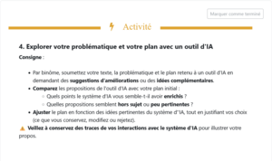 Par la suite, les élèves choisissent ou reformulent la problématique qui leur semble la plus pertinente et la soumettent à un outil d’intelligence artificielle. L’activité donne lieu à une réflexion dans le portfolio sur les écarts entre lecture humaine et suggestions automatiques.