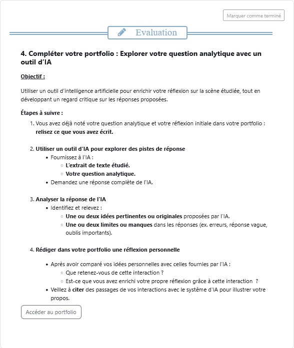 | Formative et métacognitive | Rédaction du discours du peuple + comparaison IA (Portfolio 9) | Travailler le registre lyrique, évaluer la pertinence stylistique de l’IA | |