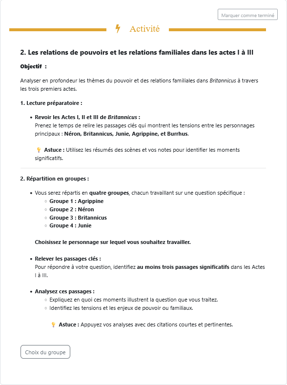 Dans cette troisième étape, les élèves abordent les actes I à III à travers un travail collectif de lecture thématique. Répartis par groupes autour de l’un des personnages majeurs (Néron, Agrippine, Junie, Britannicus), ils sélectionnent des extraits, analysent les tensions familiales et politiques, puis présentent leur lecture à l’oral. Ce travail est prolongé dans le portfolio individuel, où chaque élève rédige une synthèse.
