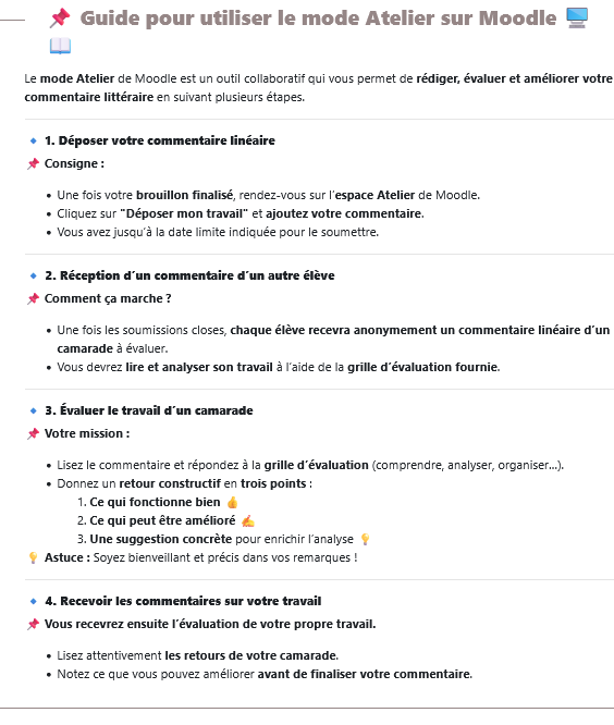 | Séance 8 | Formative / collaborative / métacognitive | Commentaire linéaire (Moodle atelier) + retour IA + évaluation par les pairs (Portfolio 11) | Expérimenter une démarche d’analyse complète, intégrer plusieurs formes de retour |