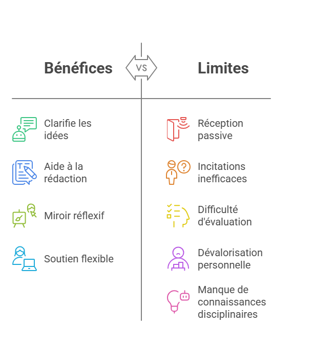 - Appui méthodologique souple : utilisée ponctuellement, et toujours dans un cadre balisé, l’IA a pu servir de soutien à des élèves en quête de repères. Certains y ont trouvé un outil pour consolider leur autonomie, d’autres un moyen de reformuler une idée, de valider une intuition ou d’enrichir une formulation.
