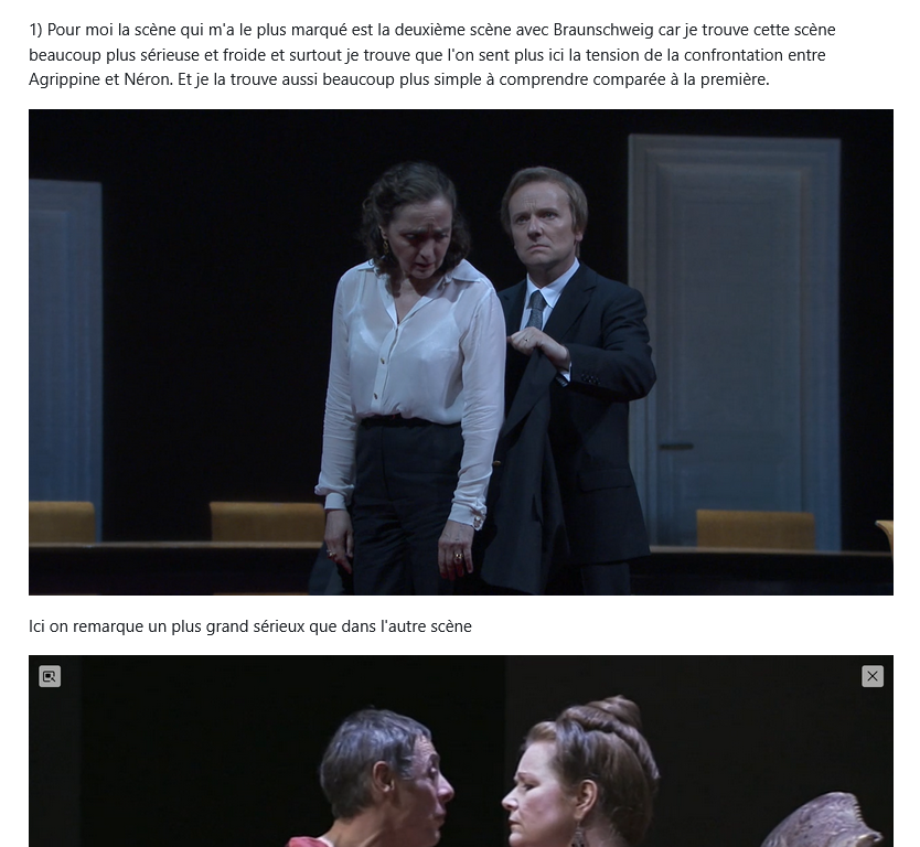 La plupart des synthèses témoignent d’une réelle implication des élèves, qui ont su identifier les moments forts de leur parcours et formuler un bilan personnel argumenté. Plusieurs ont choisi comme scène marquante l’Acte V, scène 5, souvent perçue comme un point culminant de la tension tragique. Dans un travail, cette scène est décrite comme révélatrice du basculement de Néron dans la cruauté absolue, avec une attention portée aux ruptures de ton et au contraste entre Burrhus et Narcisse. D’autres élèves se sont tournés vers l’Acte II, scène 2, pour analyser la montée de l’emprise psychologique de Néron sur Junie, parfois en écho avec les problématiques contemporaines de manipulation.