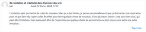 - Réflexion écrite : En conclusion, les élèves rédigent un texte réflexif. Ce moment de synthèse leur permet de contextualiser les connaissances acquises et d’exprimer leurs réflexions sur l’imitation et l’innovation dans la création artistique.