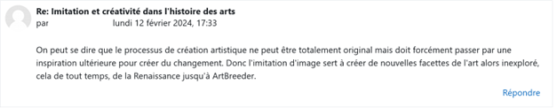 L’acte de sélectionner et de combiner des images variées illustre la notion de créativité combinatoire, inspirée des idées de Margaret Boden (voir par exemple The Creative Mind: Myths and Mechanisms, Routledge; 2e édition, 2003). Cette activité montre ainsi comment la technologie peut étendre les capacités de combinaison de l’esprit humain, facilitant une exploration créative au-delà de ce qui est immédiatement accessible. C’est ce que la 3e étape de la séance a effleuré à travers un temps de réflexion individuelle, partagée dans un forum du cours. A partir de la consigne suivante « En vous appuyant sur ces connaissances et l'expérimentation d'ArtBreeder, quelles réflexions pouvez-vous en tirer sur le rôle de l'imitation dans la création artistique ? ».