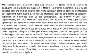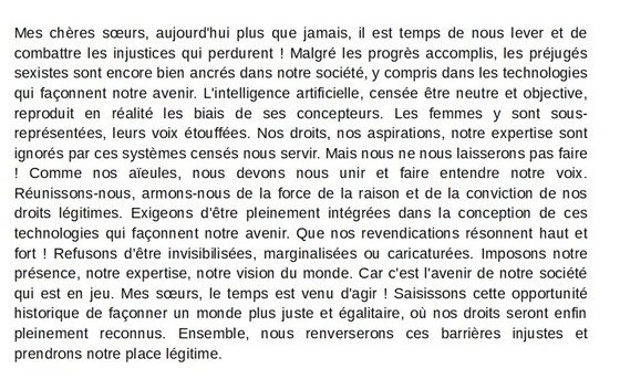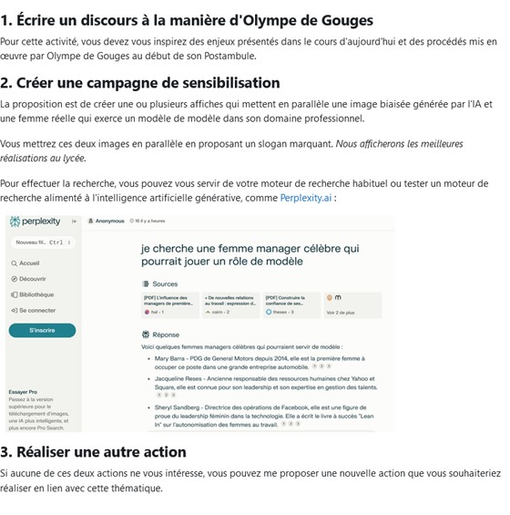 Tout comme Olympe de Gouges, qui ne se contentait pas de principes mais encourageait des changements concrets dans la société, les élèves sont invités, lors de la dernière partie de la séance, à passer à l’action en choisissant l’une des trois activités suivantes : - écrire un discours à la manière d’Olympe de Gouges pour inciter les femmes à s’investir pour renverser les biais sexistes de l’IA - créer une campagne de sensibilisation sur les biais sexistes de l’IA en mettant en parallèle des images générées par l’IA et des femmes réelles qui font figure de modèles dans leur domaine - proposer une autre action de leur choix