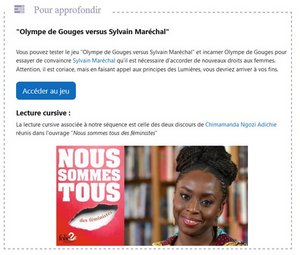 En fonction de l’avancée de leurs projets, les élèves peuvent par la suite commencer la lecture cursive des deux discours de Chimamanda Ngozi Adichie réunis dans l’ouvrage “Nous sommes tous des féministes” ou tester un jeu sérieux dans lequel ils sont invités à incarner Olympe de Gouges dans un débat d’idées avec Sylvain Maréchal sur les droits à accorder aux femmes.