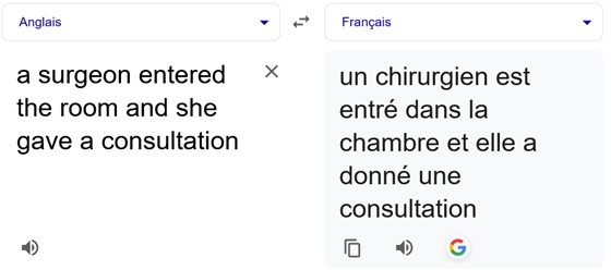 Ce dernier document illustre un exemple de biais sexiste dans la traduction automatique qui suggère ainsi que certains métiers sont plus associés à un genre qu’à un autre, malgré l’absence de telles indications dans la langue source.