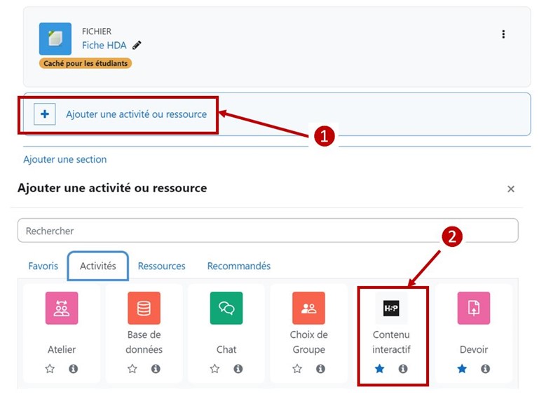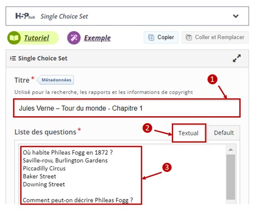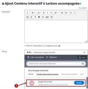 - Ajouter une activité H5P et sélectionner le type d’activité : « Single Choice Set ».