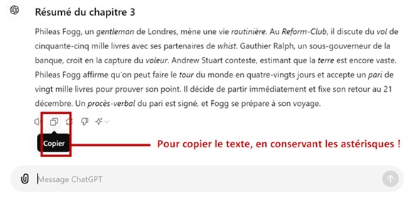 - Demander à l’IA de générer un résumé du texte envoyé en mettant entre un seul astérisque les mots clés qui rendent compte d’une compréhension générale du texte. Préciser qu’il ne peut y avoir qu’un seul mot entre les astérisques. Copier l’ensemble du résumé généré.