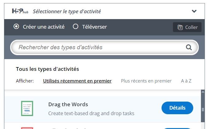 - Ajouter une activité H5P et sélectionnez « Drag the Words ».