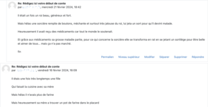 J’ai demandé aux élèves de rédiger le premier jet d’un conte à l’aide d’amorces (Il était une fois… / qui… / Mais hélas… / Heureusement/ Et…) et de le publier dans un forum Moodle.