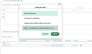 Un moment important de la séquence pédagogique a donc consisté en l’enregistrement de propos métacognitifs via le cahier de texte Pronote. En ajoutant un devoir et en cliquant sur « Mode de rendu » on peut choisir « Audio – à enregistrer sur l’espace élève (3min) »