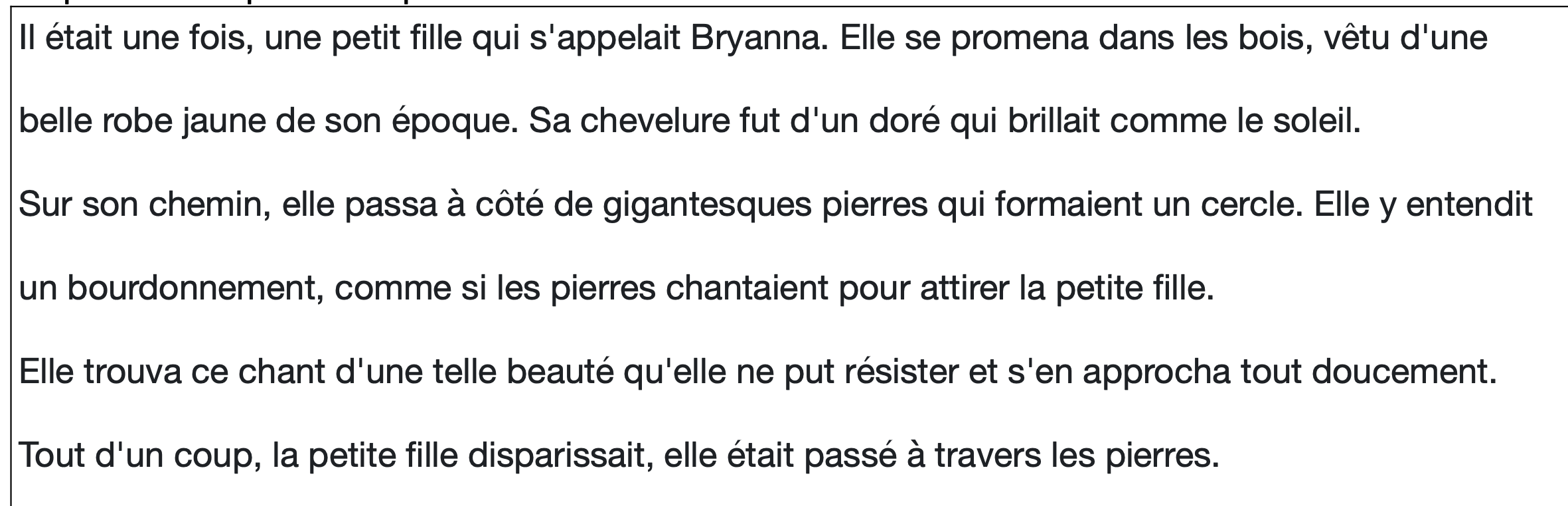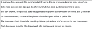 Euh… du coup « Il était une fois » : C’est juste car au début du texte on commence toujours par l’imparfait. « Une petite fille qui s’appelait Bryanna » : c’est juste parce qu’elle s’appelle toujours Bryanna. Du coup c’est une action longue, c’est à l’imparfait. « Elle se promenait dans les bois » ça peut durer des heures donc c’est à l’imparfait. « Ses cheveux brillaient comme le soleil » Ses cheveux brillent toujours comme le soleil, c’est pas seulement à un seul moment de la journée par exemple. »