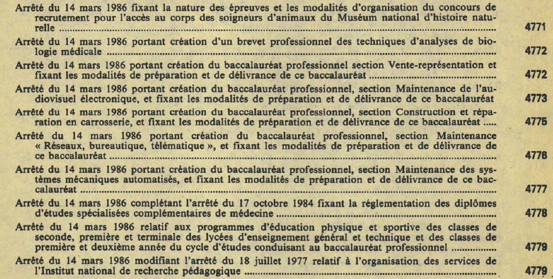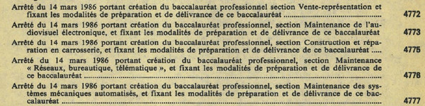 - Extraits du décret de création du bac pro : étudier des passages choisis (JO et décret du 11 mars 1986) permet de montrer l’ambition du projet, la sélection à l’entrée de ses 2 ans, la place des PFMP et/ou l’imbrication du diplôme dans la vie active. Il ne montre pas les blocages des poursuites d’études qui n’ont été levés qu’en 2008 : ce « baccalauréat » visait une insertion rapide, notamment dans les PME.