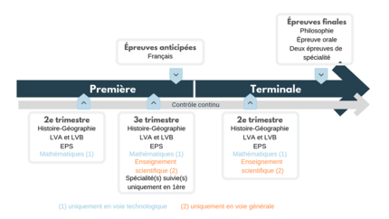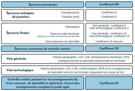 « …. L'examen des baccalauréats général et technologique évalue désormais les enseignements communs, les enseignements de spécialité choisis par l'élève et, le cas échéant, des enseignements optionnels. Il précise que les baccalauréats général et technologique sont resserrés autour d'une épreuve anticipée, écrite et orale, de français en classe de première et de quatre épreuves en classe de terminale : deux portant sur les enseignements de spécialité, une épreuve de philosophie, et une épreuve orale terminale. Il introduit, en outre, une part de contrôle continu dans l'évaluation des enseignements pour la délivrance du baccalauréat. En dernier lieu, le décret prévoit que seules les notes des épreuves terminales supérieures ou égales à dix peuvent désormais être conservées, après un échec à l'examen, pendant les cinq sessions qui suivent la première session à laquelle les candidats se sont présentés. »