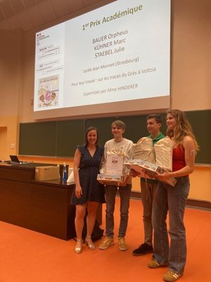 - 1er prix des Olympiades de Géosciences : Bauer Orpheus, Kühner Marc et Staebel Julie du lycée Jean Monnet de Strasbourg, pour le travail sur le grès à Voltzia ;