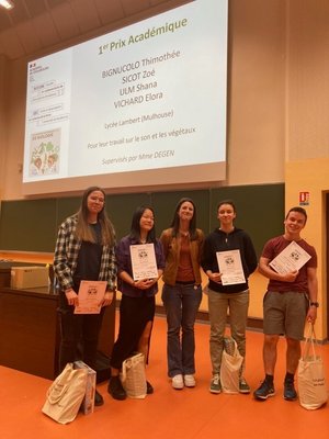 - 1er prix des Olympiades de Biologie : Bignucolo Thimothée, Sicot Zoé, Ulm Shana et Vichard Elora du lycée JH Lambert de Mulhouse, pour leur travail sur la perception du son par les végétaux ;